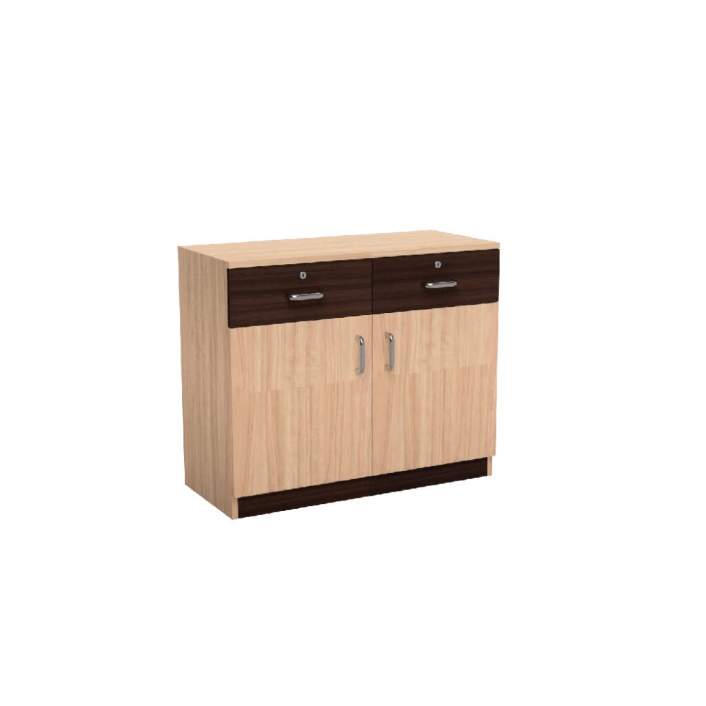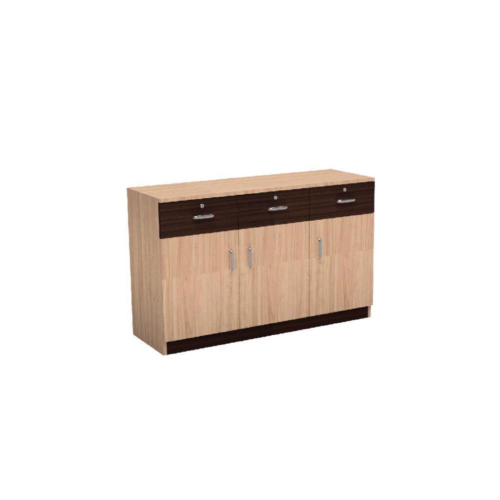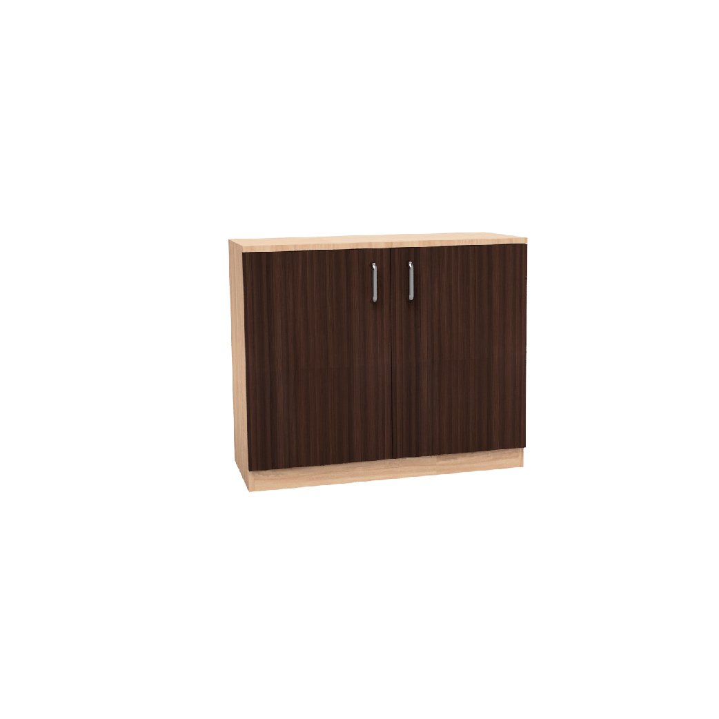 This two-tone side unit is crafted from high-quality engineered wood, ensuring long-lasting durability and stability. The light wood frame contrasts beautifully with the darker wood-finished cabinet doors, making it a standout piece for your office or living space. The unit is equipped with sleek metal handles that provide easy access to the internal storage shelves, offering a perfect blend of modern design and functionality.
