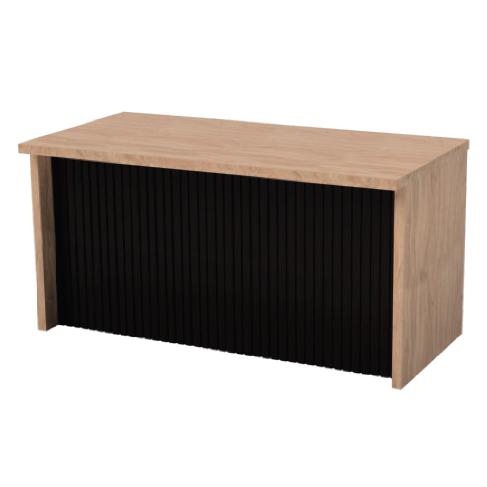 A premium executive office table featuring a spacious wooden work surface paired with a contrasting vertical slatted front panel—offering modern elegance, functional comfort, and a refined professional presence.