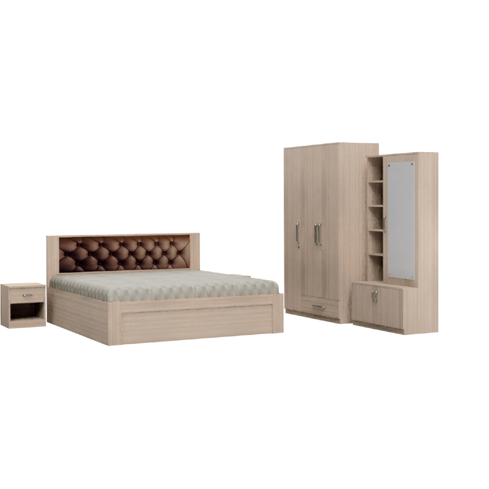 Crafted from high-quality engineered wood in a warm, natural finish, this bedroom set is ideal for modern homes looking for durability, functionality, and refined aesthetics.
