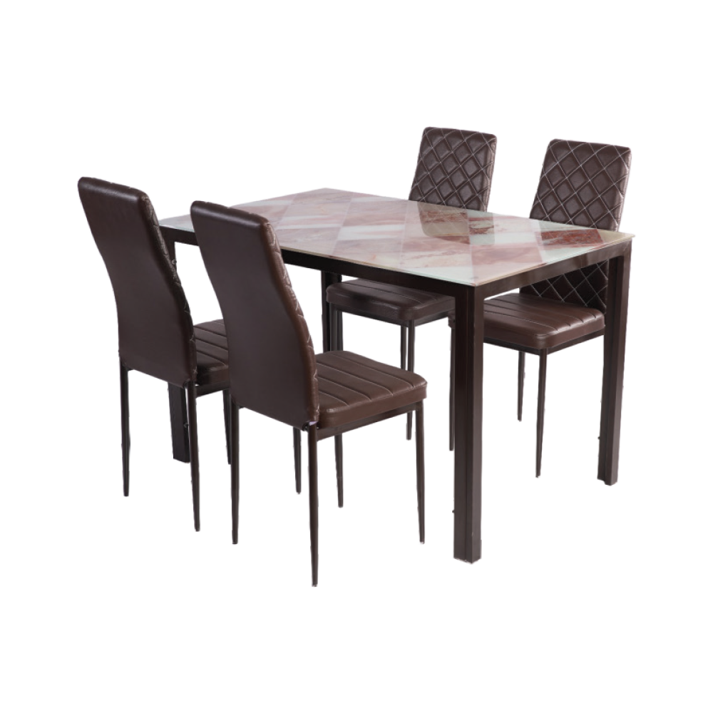 This elegant 4-seater dining table set blends contemporary design with everyday comfort. The rectangular table is topped with a premium marble-pattern tempered glass surface that adds a luxurious look while being easy to clean and maintain. Its sturdy frame ensures long-lasting stability, making it ideal for daily family use.