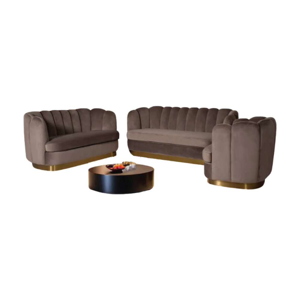 A luxurious 3+2 sofa set with scalloped channel-tufted upholstery, gold-tone base accents, and bold contemporary styling—crafted to enrich modern living spaces with elegance and comfort.