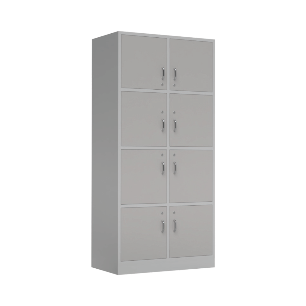 A durable and space-efficient steel locker cabinet with 8 individual lockable compartments, ideal for offices, institutions, factories, and shared storage environments.
